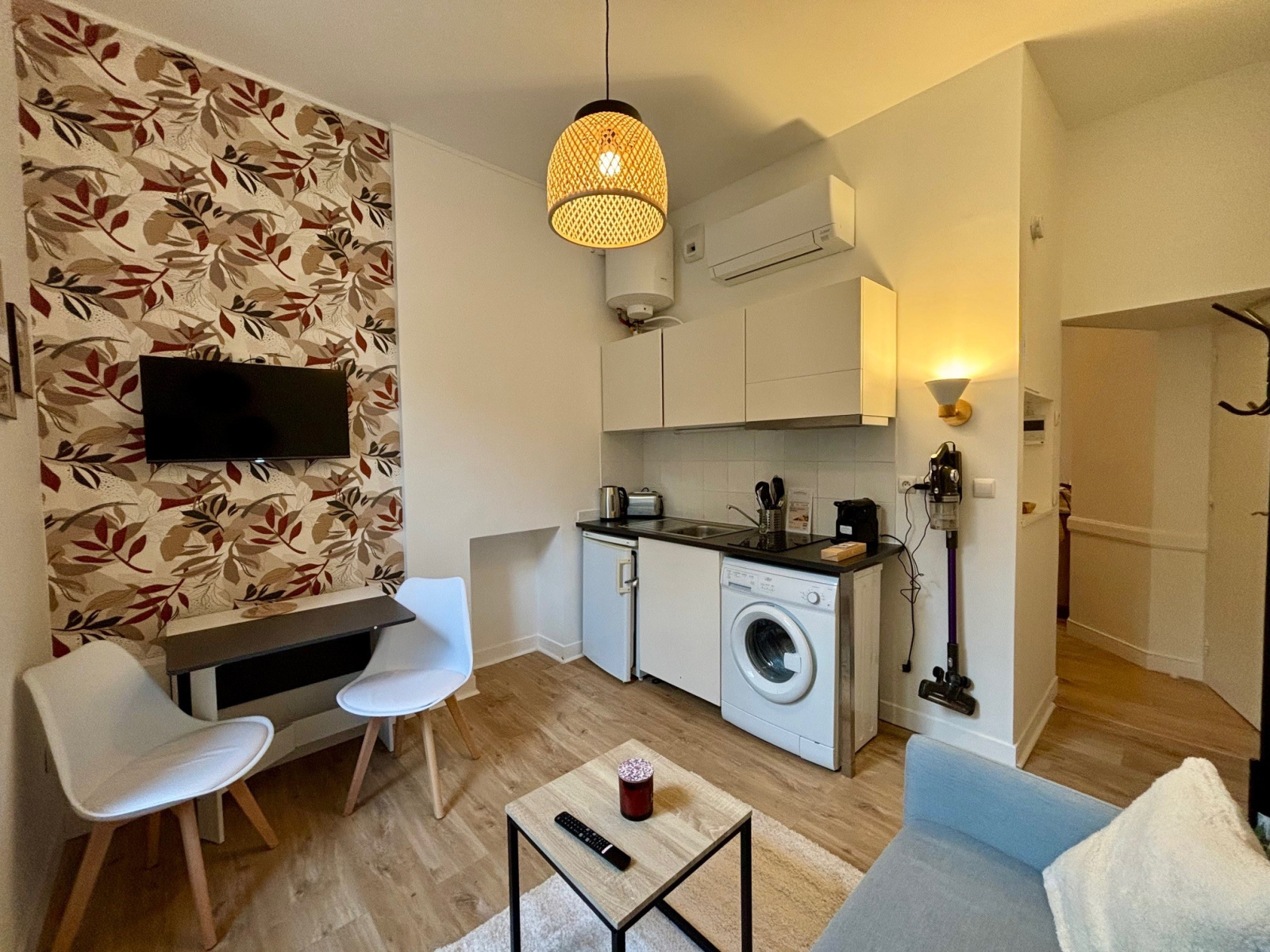 Il se compose d'un séjour avec canapé et TV, ainsi que d'un coin cuisine équipée, avec machine à café, grille-pain, bouilloire, micro-onde, lave-linge, vaisselle, ...