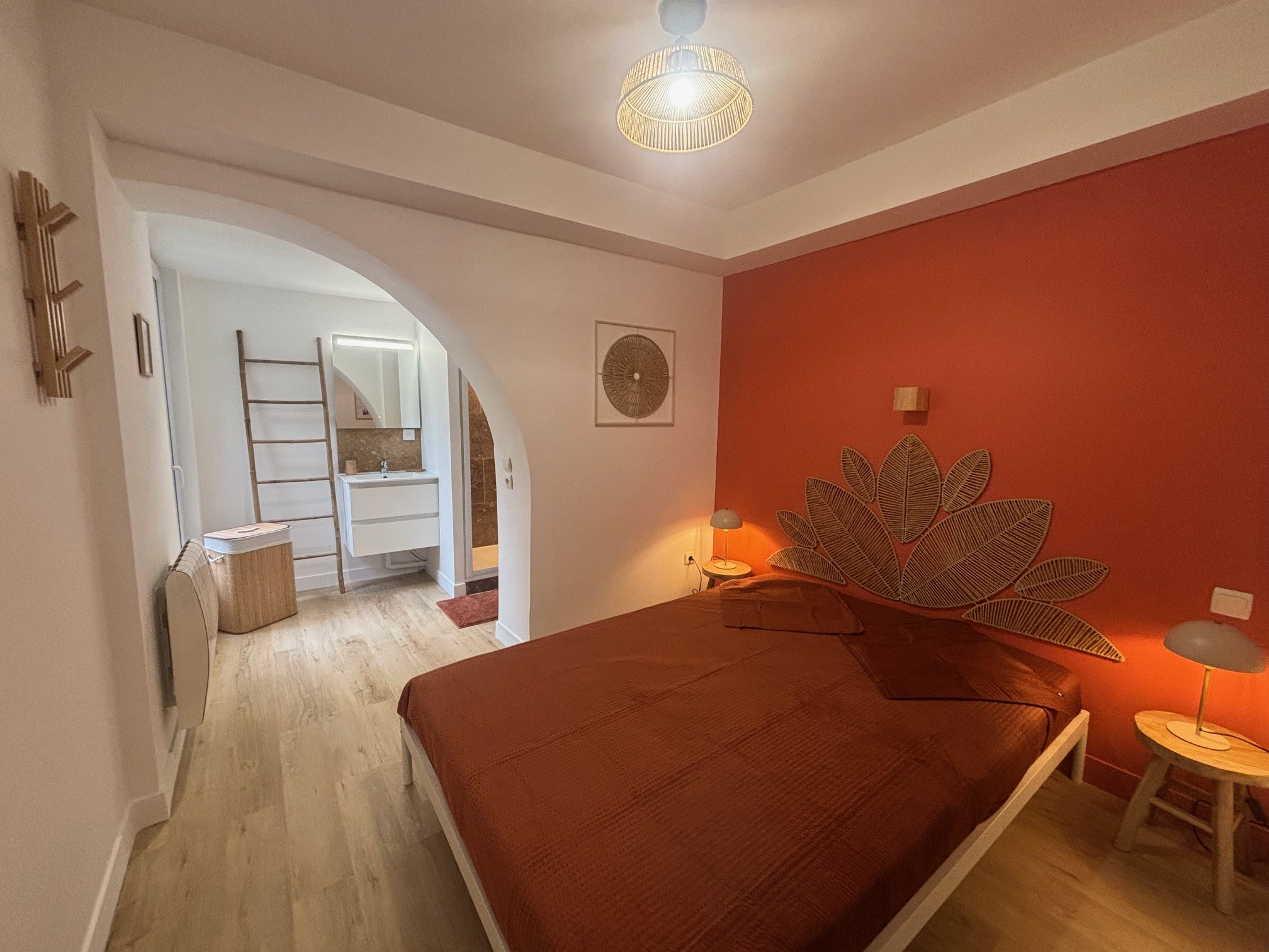 Une chambre avec salle d'eau ouverte ainsi qu'un WC séparé.