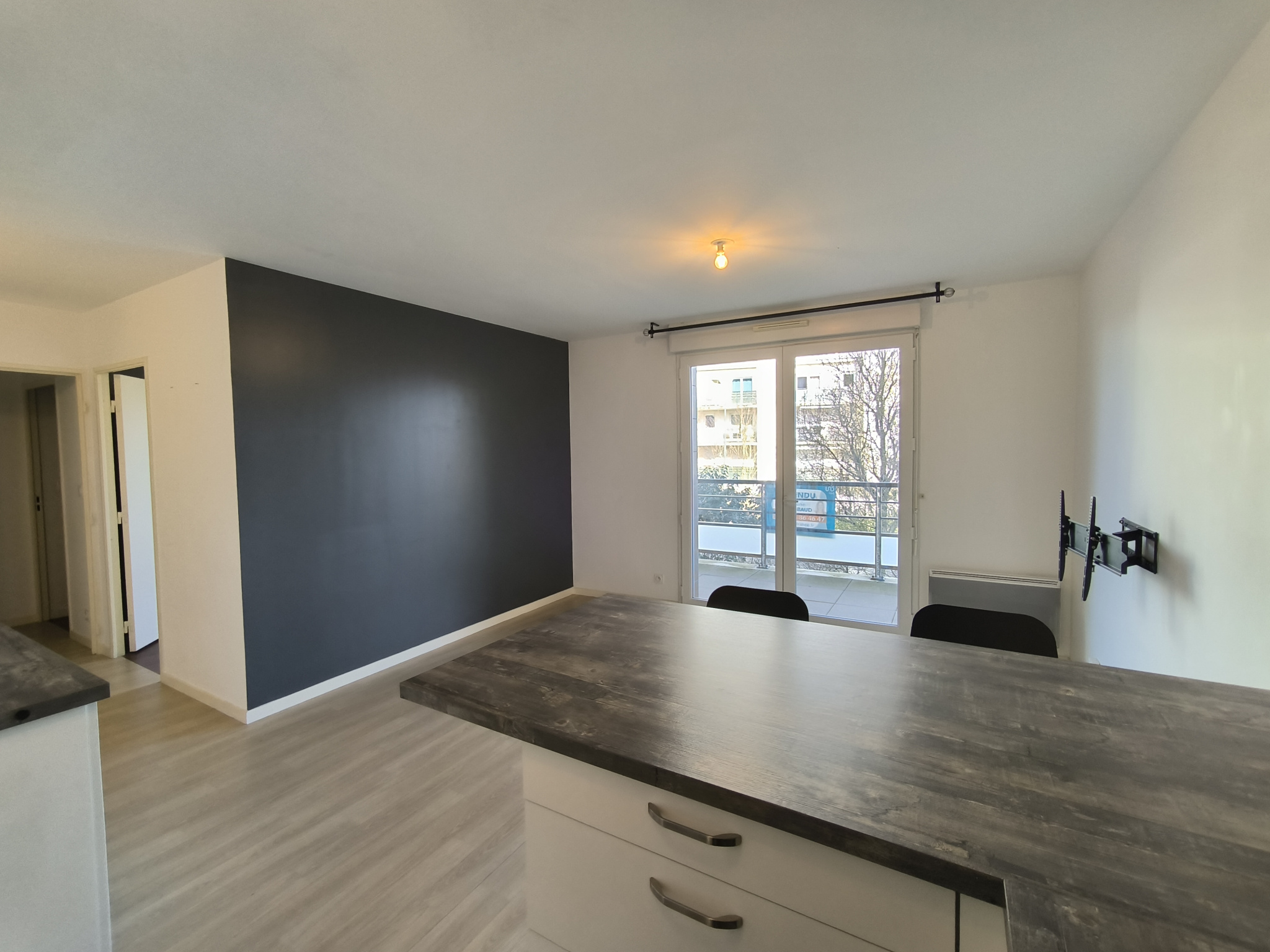 Une cuisine aménagée et équipée ouverte sur un espace de vie lumineux donnant accès à un grand balcon